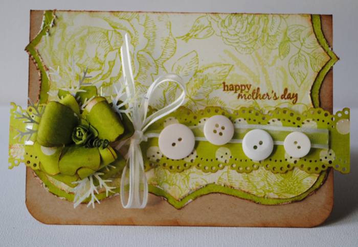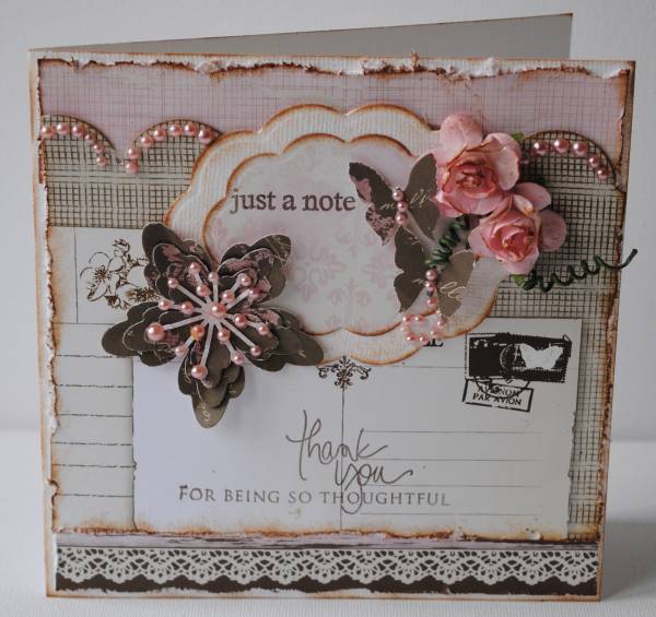 Cardstock; wit bazzill, p.p. kaisercraft devonshire , mcGill takjespons, papertreyink stempel, prima marketing bloemetje, wit lintje, knopen, martha steward doily lace borderpons, edge distresser.
