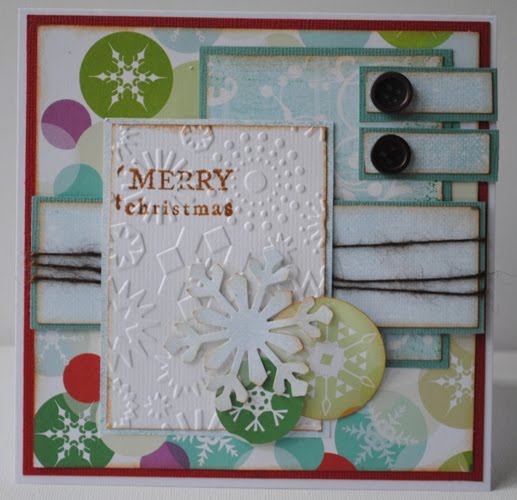 Cardstock; wit, rood en blauw bazzill, p.p: creative imaginations, knoopjes, cuttlebug embossingfolder kerst, martha steward sneeuwvlokpons en bruin touwtje.