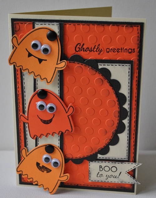 Cardstock; cremekleurig, zwart en oranje bazzill, Dies en stempels van papertrey ink, quickutz embossingfolder polka dots, zwarte fineliner, spellbinder nestabilities, zwarte brads, wiebeloogjes.