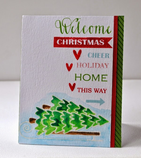 Cardstock; rood, groen en watercolor papier, Stempels SSS, achtergrondstempel stripes hero arts, glossy accents, watercolor verf, watermark inkt, witte en clear embossingpoeder en heatgun.