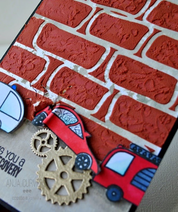 Cardstock; zwart, watercolor papier, distress inkt, wendy vecchi embossingpaste wit, create a smile stamps whymsical wheels, chipboard gears en wall stencil wycinanka.