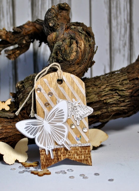Houtnerf papier EK succes, vellum, die en stempels vlinders clearly besotted stamps, die tag PTI, touwtje, sequins SSS, witte embossingpoeder, achtergrondstempel ?, stencil SSS, wendy vecchi embossingpaste wit, zilver glitter embossingpoeder tim holtz.