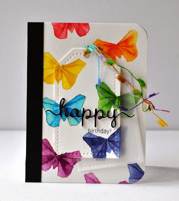 Cardstock; watercolor papier en zwart, stempels altenew, distress inkt, fiber, tagdie PTI, vellum, ronde hoekpons, die happy clearly besotted, clear embossingpoeder, sentimentstempel newton nooks design.