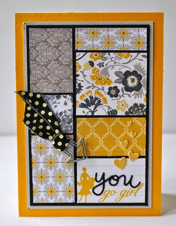 Cardstock; geel, grijs en zwart, p.p; authentique SSS cardkit, hartjesdie mama elephant, pin, lintje.