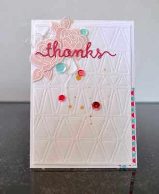 Cardstock; wit en roze, embossingfolder memorybox, roze vellum, stempels winnie &walter, witte embossingpoeder, heidi swapp goud glitterspray, sequins, washi-tape action, thanks die clearly besotted stamps, borduurgaren.