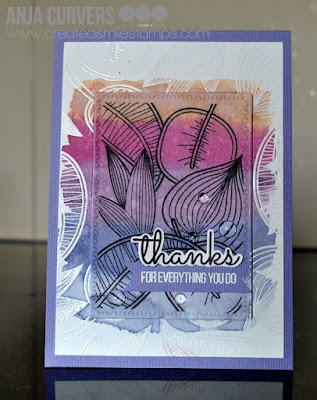 Cardstock; lila, watercolor papier, stempels create a smile, clear droplets pretty pink posh, distress ink, clear embossingpoeder, rechthoekige die My favorite things.