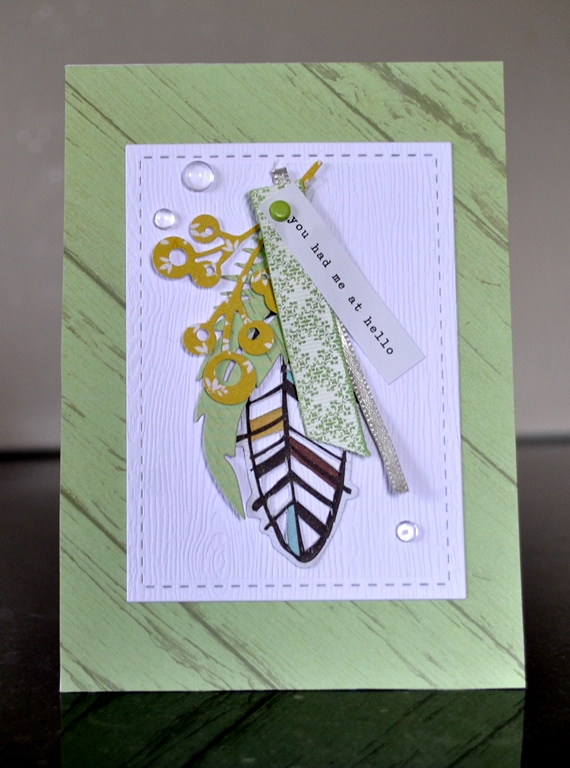 Cardstock; houtnerf embost wit, p.p; kaiserkraft, veerdie léncre et límage, crealies blaadjesdie, lintjes, brad, waterdroplets pretty pink posh, my favorite things rechthoekige die.